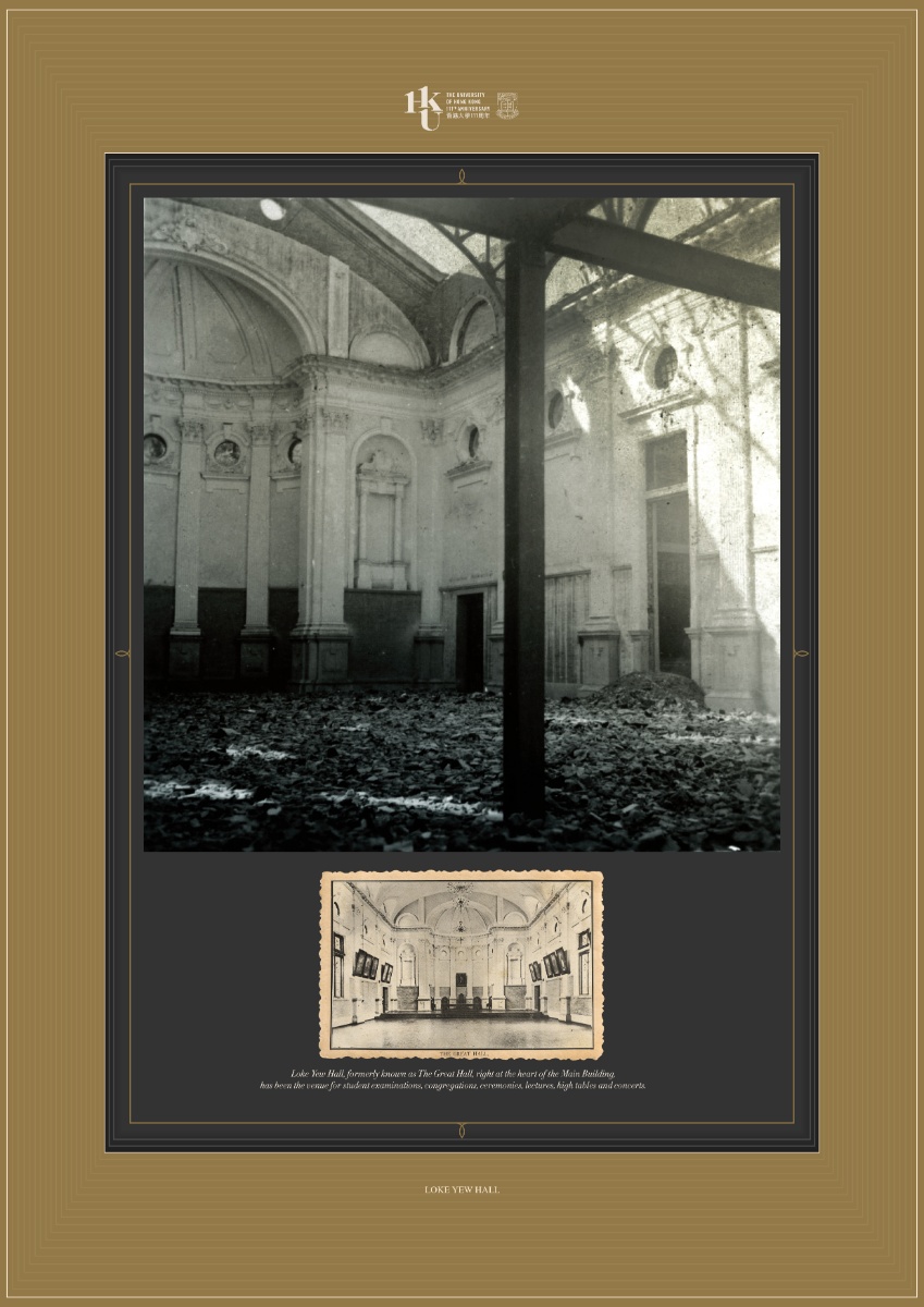 The people of Hong Kong suffered deeply during the Second World War when Japan invaded and occupied the city. At this time, Loke Yew Hall was still known as the Great Hall, the oldest structure at HKU and today a declared monument. Following the outbreak of war, it served as a relief hospital, while timber from the roof was later used for fuel. Its transformation from an ornate ceremonial structure was remarked on: it had become a “roofless skeleton, stripped of equipment, furnishing and fittings, floors and stairs”.