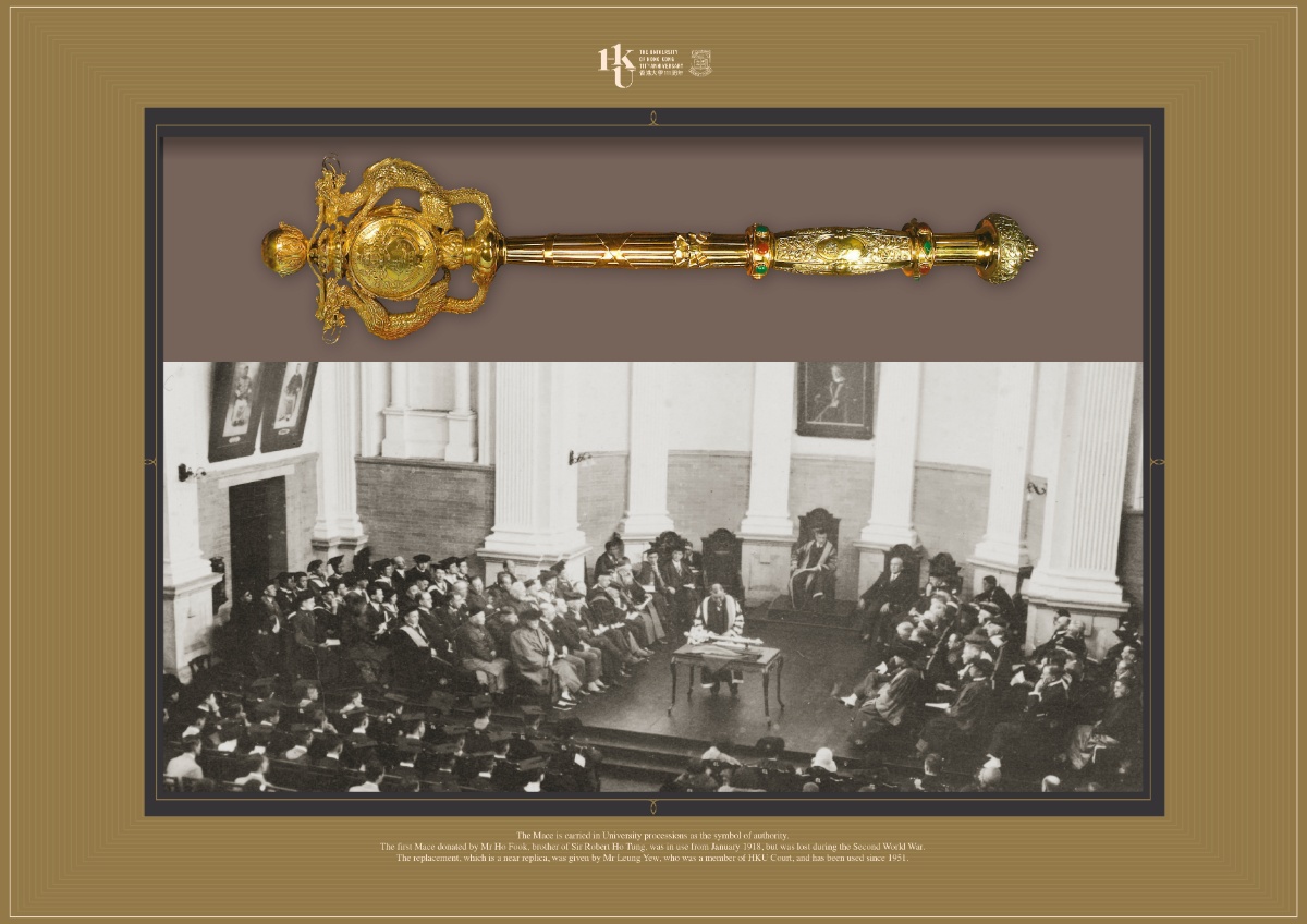 The Mace is a ceremonial staff and carried in university processions as a symbol of authority. It is highly ornamental with sterling silver gilt, with a design of ribbons, panels and rods, and set with stones including red amber and green jade. It measures 40 inches long. The first Mace was donated by Mr. Ho Fook, younger brother of Sir Robert Hotung, and was used from 1918 until it was lost during the Second World War. A replacement given by Mr. Leung Yew, a member of the HKU Court, is a near replica of the original piece and has been in use since 1951 to the present day.